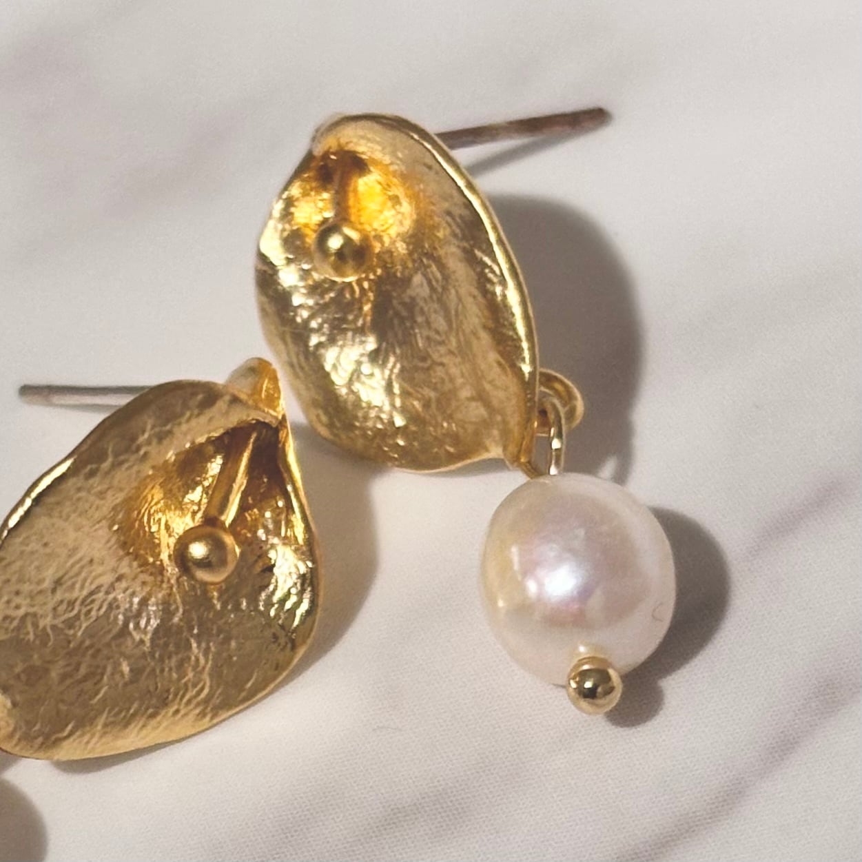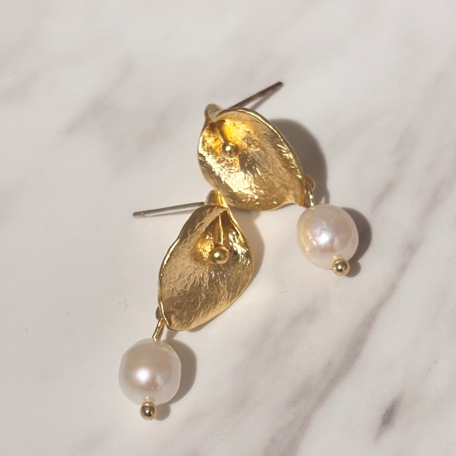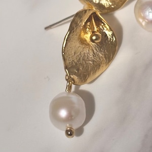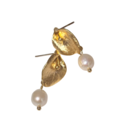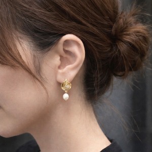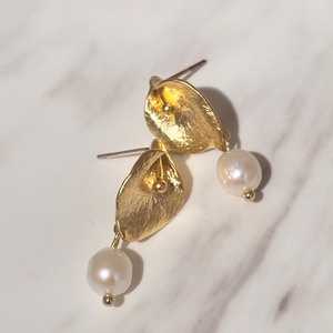 カラーリリーの花をイメージしたゴールドモチーフに、淡水パールを添えたピアス。